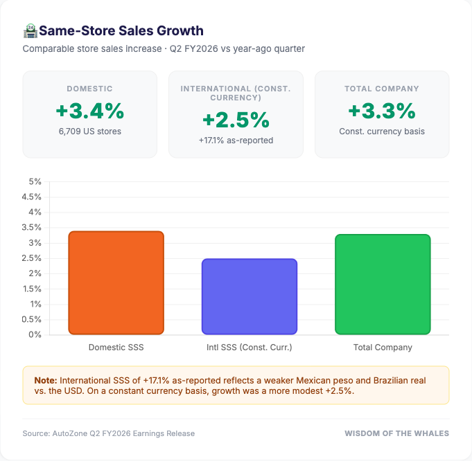 Management flagged winter storms as a meaningful headwind in the back half of Q2. Auto parts demand is highly weather-correlated — storms suppress DIY repair activity. The fact that comps stayed positive through those disruptions speaks to the durability of AutoZone's customer base.