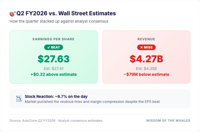 AutoZone just reported Q2 FY2026 earnings, and the headline numbers tell two different stories. Revenue grew 8% year-over-year. EPS technically beat estimates. And yet the stock fell nearly 7% on the day. So what happened?