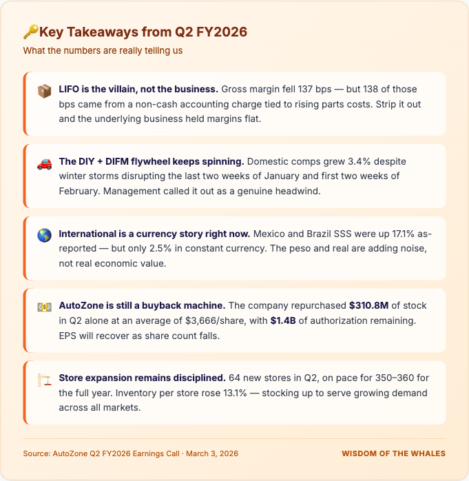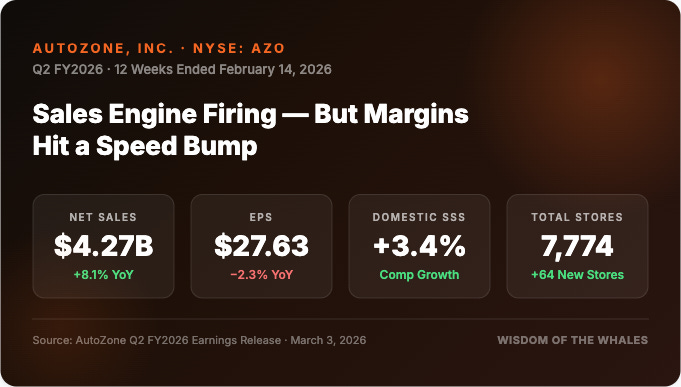 AutoZone's Q2 FY2026 was a tale of optical vs. operational performance. The business grew 8%. Comps stayed positive through weather disruptions. New stores opened on schedule. And a $310.8M share buyback program is steadily reducing the share count.