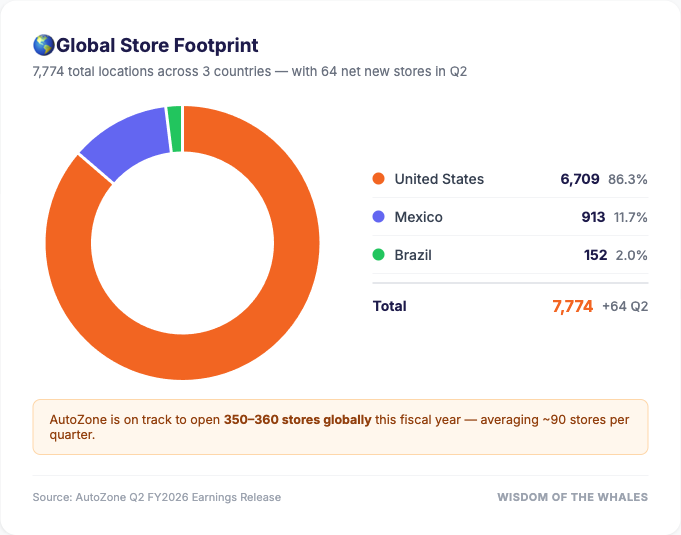 The US footprint dominates at 6,709 stores (86% of total), but Mexico (913 stores) and Brazil (152 stores) represent the growth runway. International expansion is the long game — and AutoZone is playing it methodically.