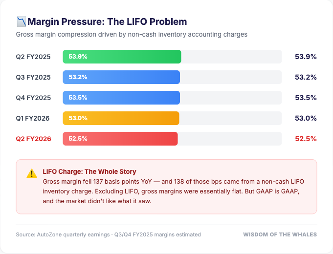 LIFO (Last In, First Out) inventory accounting means that when parts costs rise, AutoZone's cost of goods sold reflects the higher-priced inventory first — even if those parts haven't actually been sold yet. It's an accounting methodology, not a cash expense. Excluding LIFO, gross margins were essentially flat year-over-year.