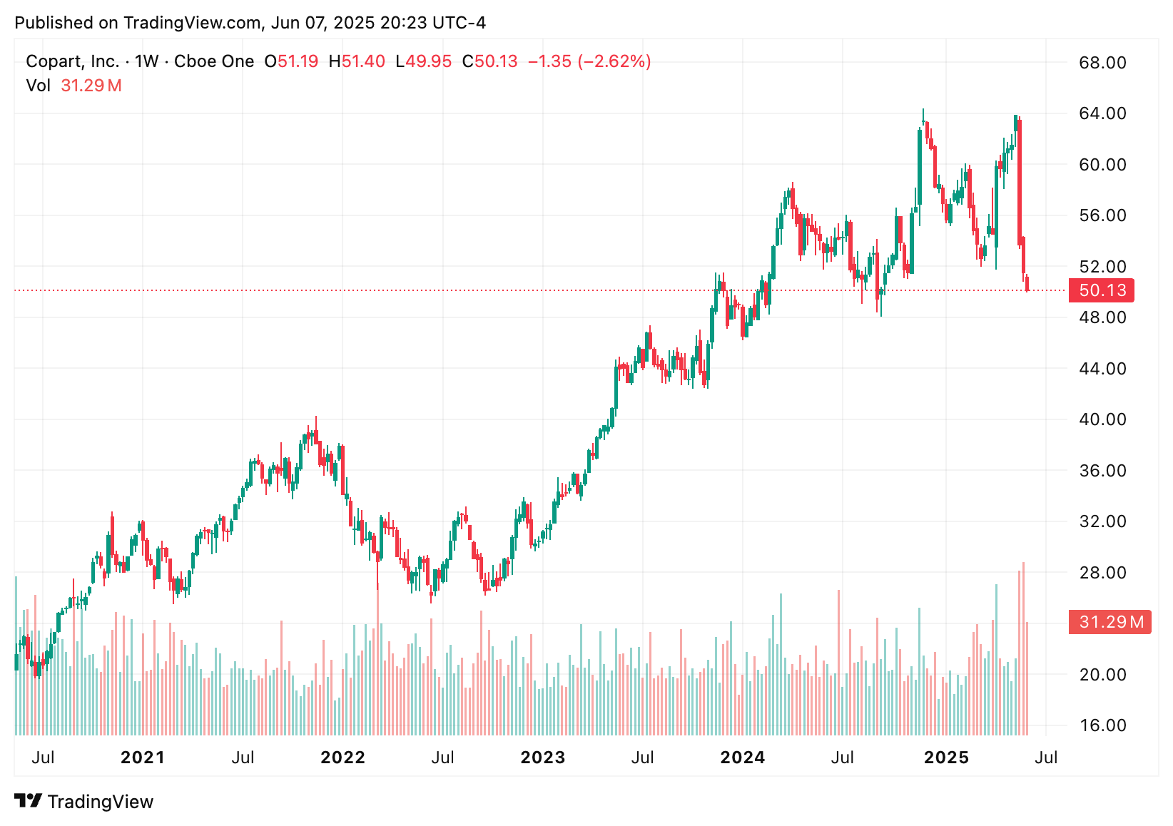 Action: Current investors should hold their positions, while new investors should consider building positions on any weakness below $48 per share. The combination of secular growth trends and market leadership makes Copart an attractive long-term holding despite current valuation concerns.