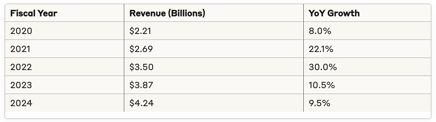 Copart has delivered exceptional long-term growth, with revenue expanding from $254 million in fiscal 2001 to $4.24 billion in fiscal 2024 - a compound annual growth rate of approximately 13%. The growth has been particularly impressive over the past five years: