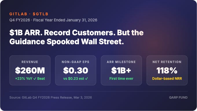 GitLab had a genuinely strong Q4. The $1B ARR milestone is meaningful. The $400M buyback shows management confidence. Enterprise customer growth at the $1M+ tier is accelerating.