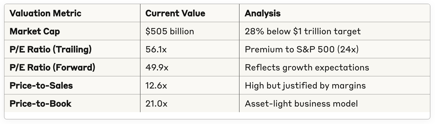 Current Valuation: $505 billion market cap, trading at 56x trailing P/E
