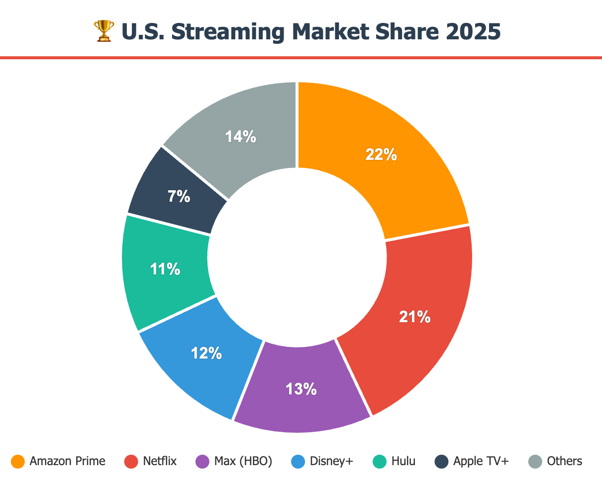 Amazon Prime Video leads the U.S. streaming market, holding a 22% share, while Netflix remains a close competitor with 21%. However, Netflix actually has the true majority of market share as subscribers use the platform solely for its content, unlike Prime Video which is bundled with Amazon's broader ecosystem.