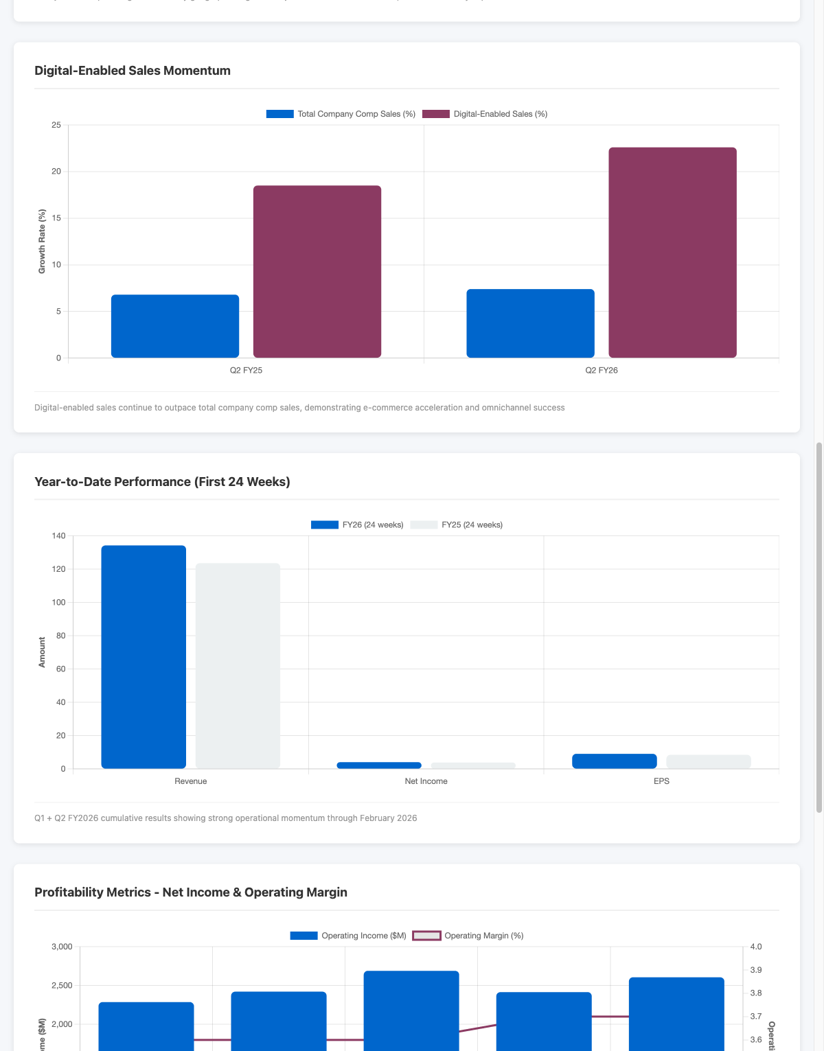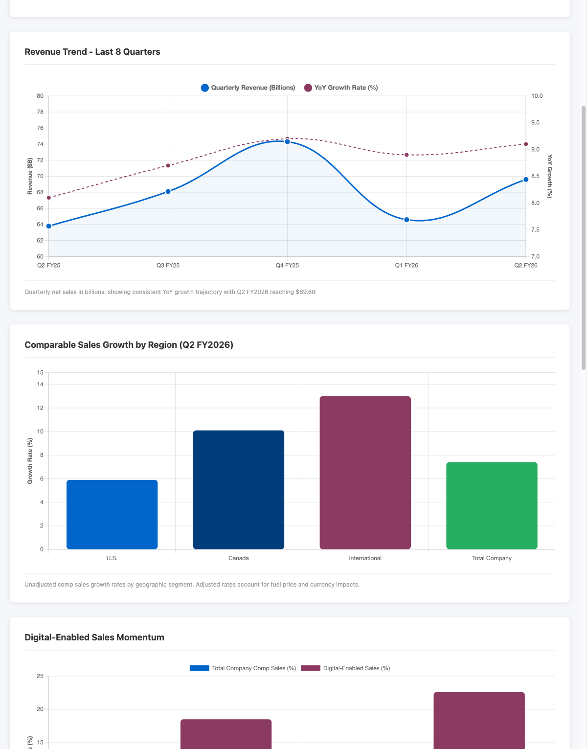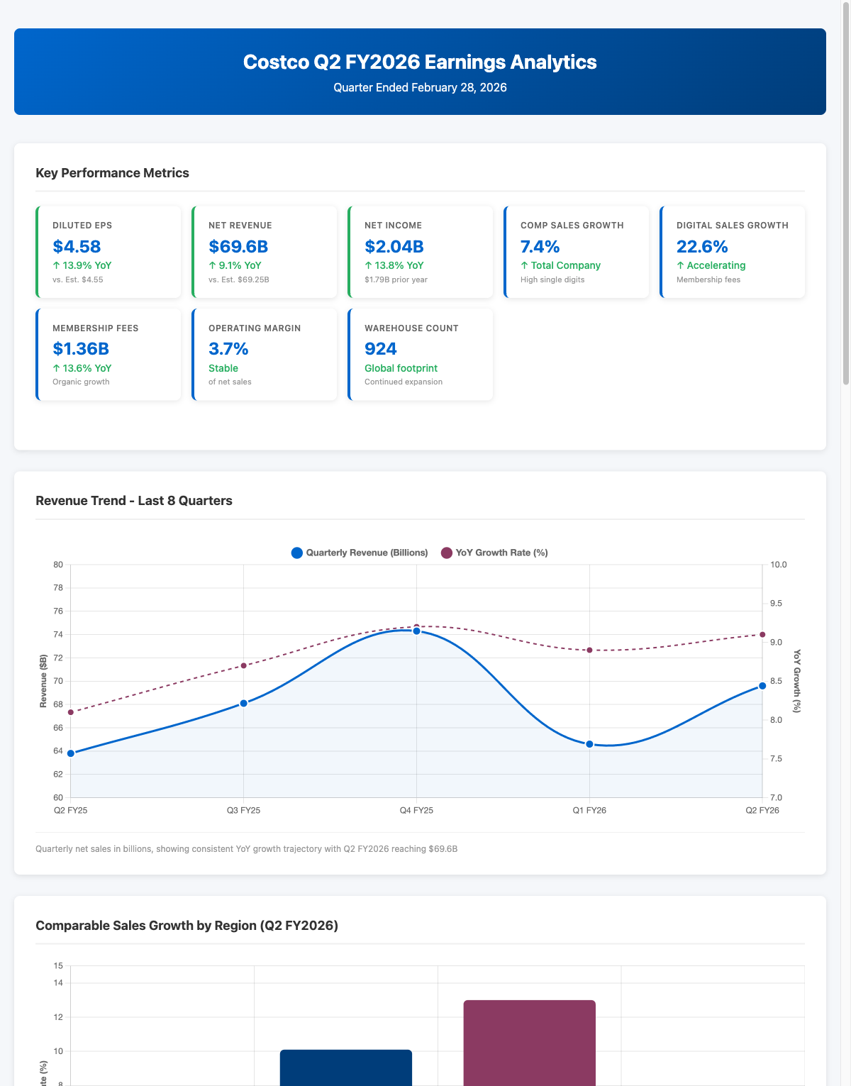 One of the most overlooked aspects of Costco's business is operating margin stability. In Q2, the company maintained 3.7% operating margins despite revenue growing at 9.1% year-over-year. This isn't a company squeezing margins to make the numbers; it's a company that has optimized its cost structure so thoroughly that it can invest in digital, expand its footprint to 924 warehouses worldwide, and still deliver steady profitability.