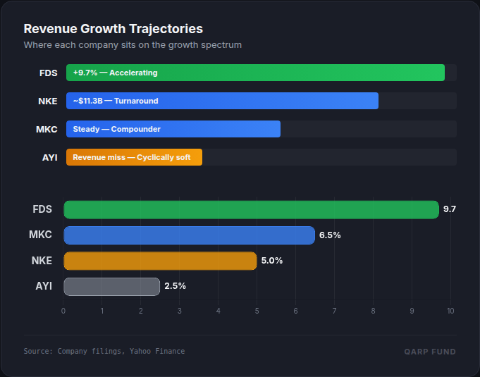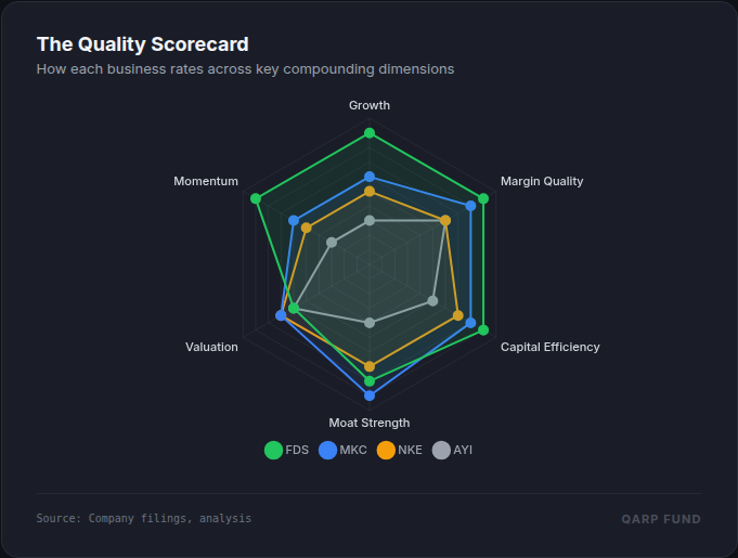 The quality premium isn’t about today’s beat. It’s about what tomorrow looks like. McCormick’s next quarter looks like this one. FactSet’s next quarter looks like this one, but with 20 basis points more margin. Nike’s next quarter could look like this one or it could look like the three that came before — that’s the difference between certainty and hope.